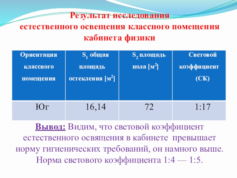 естественного освящения в кабинете превышает норму гигиенических требований, он намного выше. Норма светового коэффициента 1:4 — 1:5.