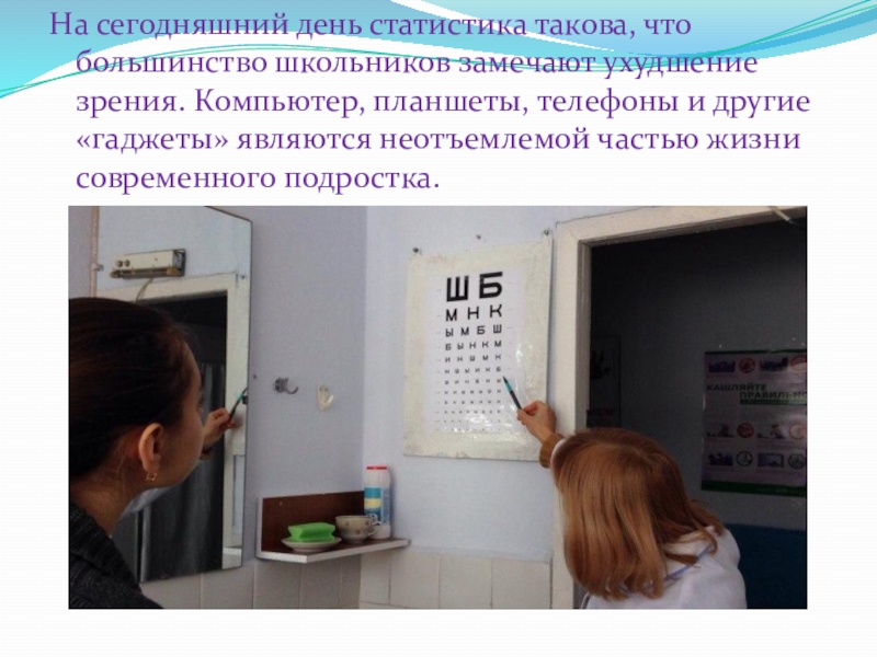 Слайд 2На сегодняшний день статистика такова, что большинство школьников замечают ухудшение зрения.