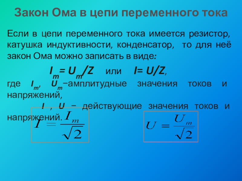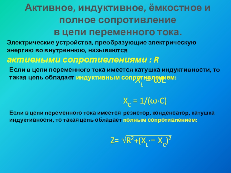 Если в цепи переменного тока имеется резистор, конденсатор, катушка индуктивности, то такая цепь обладает полным сопротивлением: