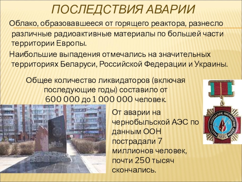 От аварии на чернобыльской АЭС по данным ООН пострадали 7 миллионов человек, почти 250 тысяч скончались.