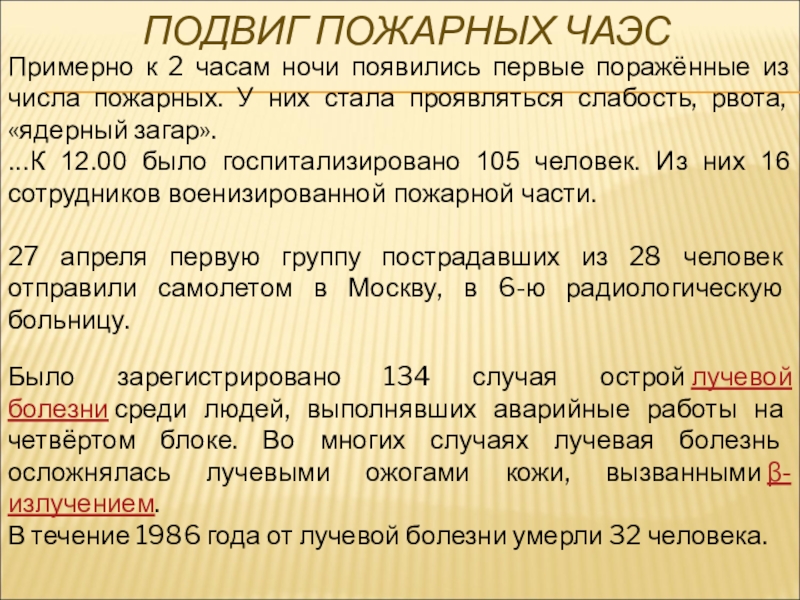 В течение 1986 года от лучевой болезни умерли 32 человека.