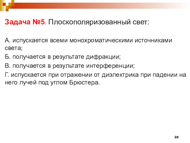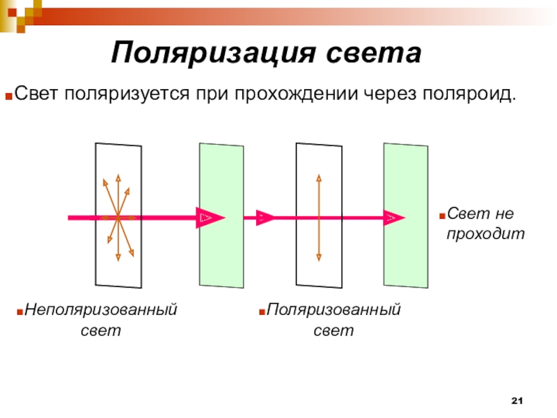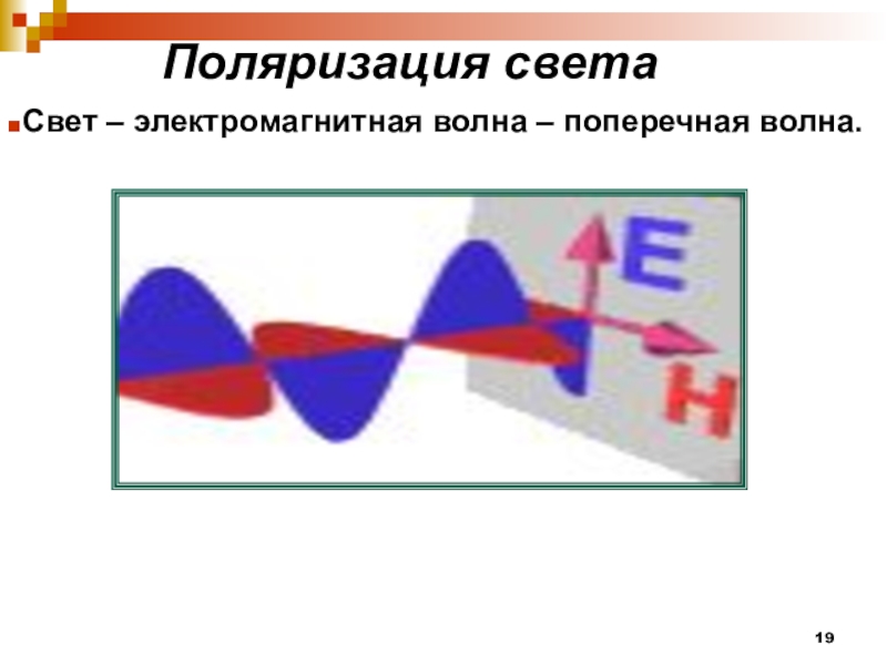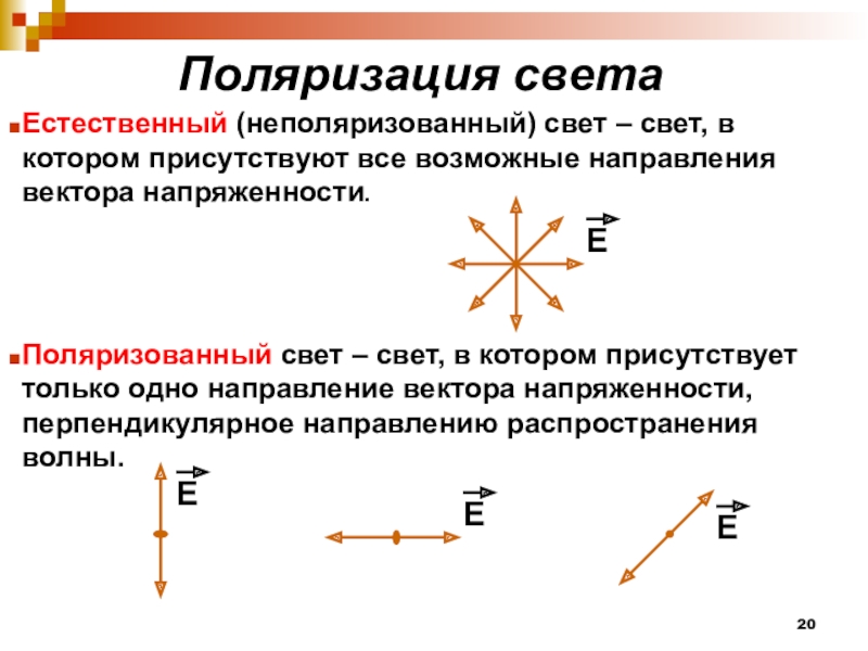 Поляризованный свет – свет, в котором присутствует только одно направление вектора напряженности, перпендикулярное направлению распространения волны.
