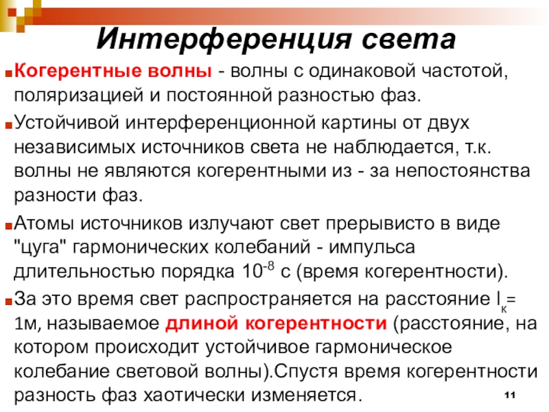 Устойчивая во времени интерференционная картина может наблюдаться только при сложении когерентных волн.