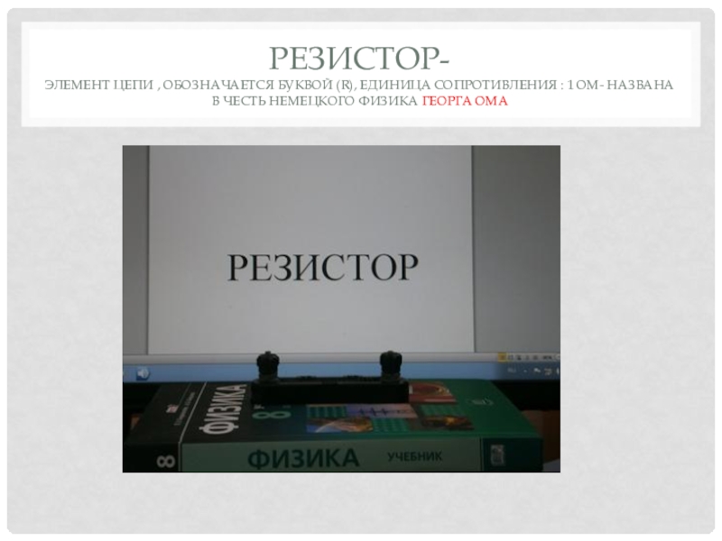Резистор- ЭЛЕМЕНТ ЦЕПИ , ОБОЗНАЧАЕТСЯ БУКВОЙ (r), Единица сопротивления : 1 ом- названа в честь немецкого физика