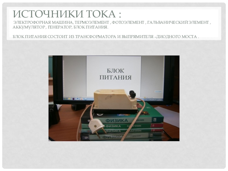 Источники тока : Электрофорная машина, термоэлемент , фотоэлемент , гальванический элемент , аккумулятор , генератор, блок питания. блок питания состоит из трансформатора и выпрямителя –диодного моста .