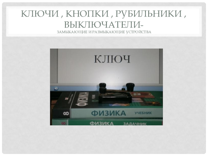 Слайд 5Ключи , кнопки , рубильники , выключатели- замыкающие и размыкающие устройства