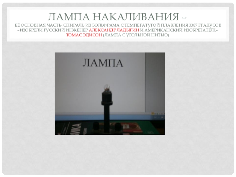 Лампа Накаливания –  её основная часть- спираль из вольфрама с температурой плавления 3387 градусов –изобрели русский