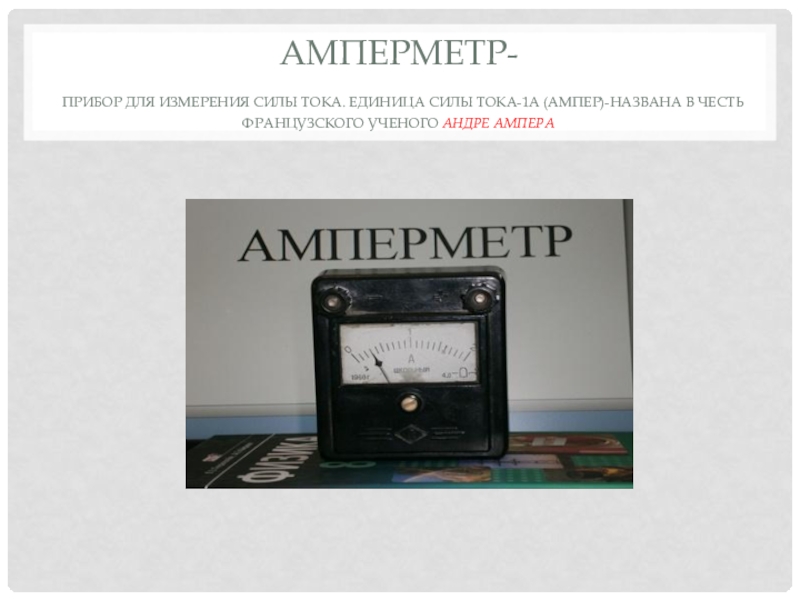 Слайд 7Амперметр- прибор для измерения силы тока. Единица силы тока-1а (ампер)-названа в