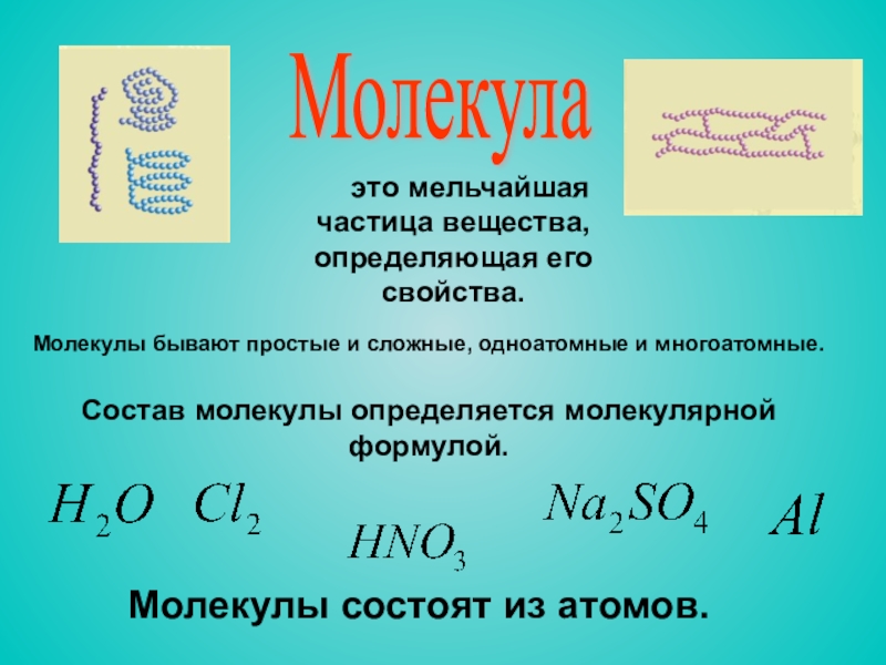 Молекулы бывают простые и сложные, одноатомные и многоатомные.