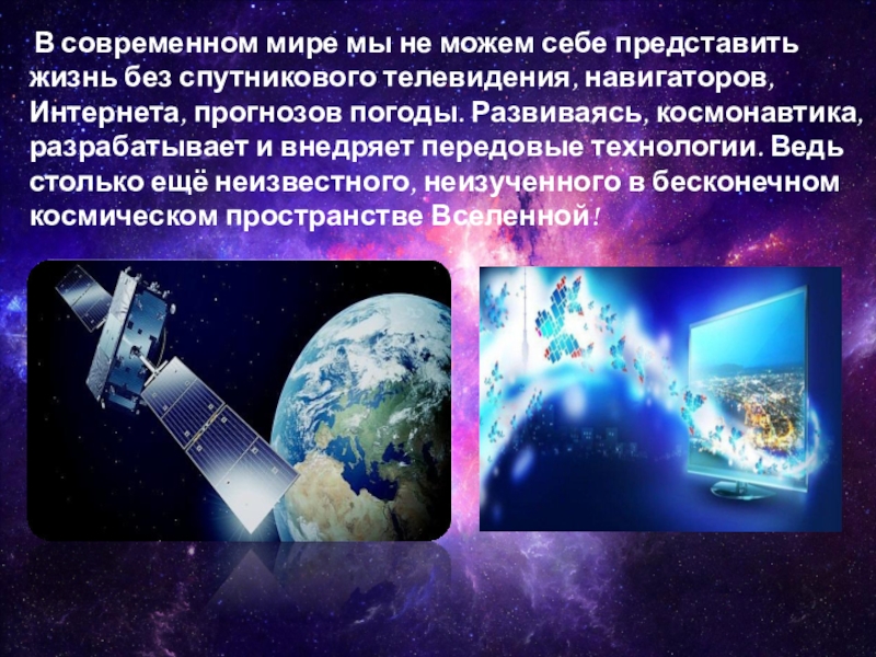 телевидения, навигаторов, Интернета, прогнозов погоды. Развиваясь, космонавтика, разрабатывает и внедряет передовые технологии. Ведь столько ещё неизвестного, неизученного в бесконечном космическом пространстве Вселенной!