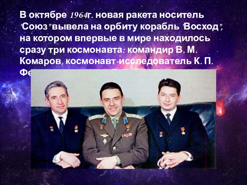 "Восход", на котором впервые в мире находилось сразу три космонавта: командир В. М. Комаров, космонавт-исследователь К. П. Феоктистов и врач Б. Б. Егоров.