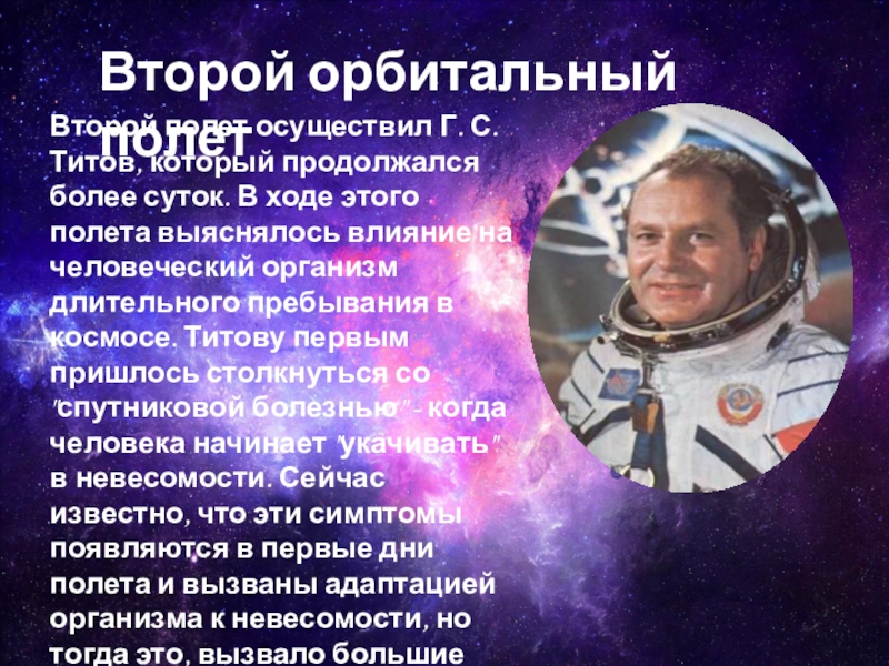 более суток. В ходе этого полета выяснялось влияние на человеческий организм длительного пребывания в космосе. Титову первым пришлось столкнуться со "спутниковой болезнью" - когда человека начинает "укачивать" в невесомости. Сейчас известно, что эти симптомы появляются в первые дни полета и вызваны адаптацией организма к невесомости, но тогда это, вызвало большие опасения, и были разработаны специальные методы тренировки вестибулярного аппарата космонавтов.