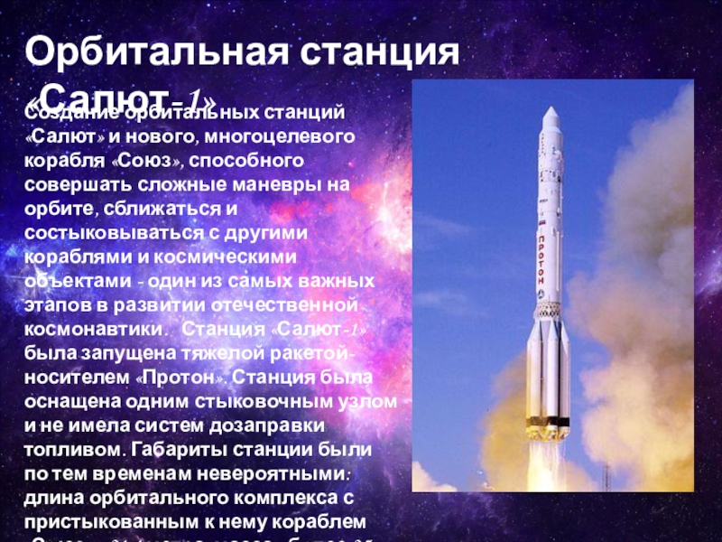 «Союз», способного совершать сложные маневры на орбите, сближаться и состыковываться с другими кораблями и космическими объектами - один из самых важных этапов в развитии отечественной космонавтики. Станция «Салют-1» была запущена тяжелой ракетой-носителем «Протон». Станция была оснащена одним стыковочным узлом и не имела систем дозаправки топливом. Габариты станции были по тем временам невероятными: длина орбитального комплекса с пристыкованным к нему кораблем «Союз» - 21,4 метра, масса - более 25 тонн.