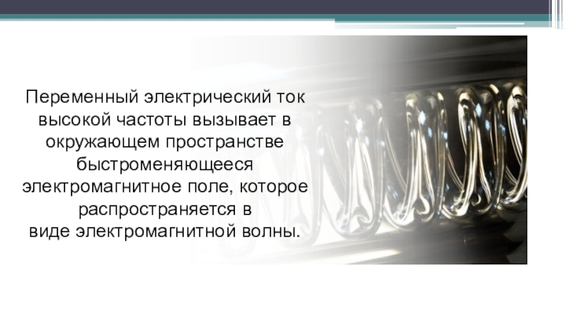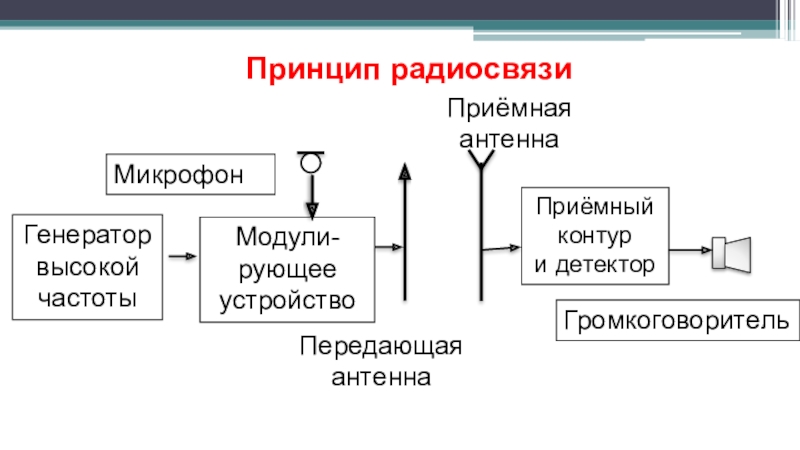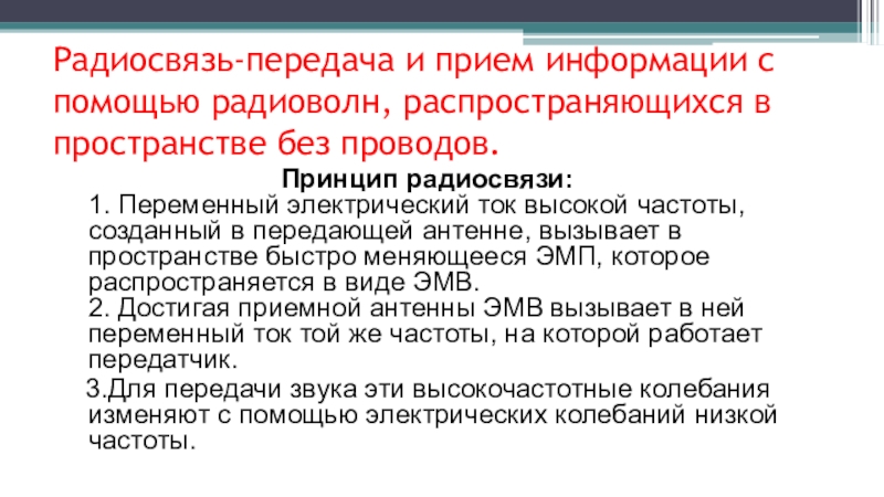 Принцип радиосвязи: 1. Переменный электрический ток высокой частоты, созданный в передающей антенне, вызывает в пространстве быстро меняющееся ЭМП, которое распространяется в виде ЭМВ. 2. Достигая приемной антенны ЭМВ вызывает в ней переменный ток той же частоты, на которой работает передатчик.