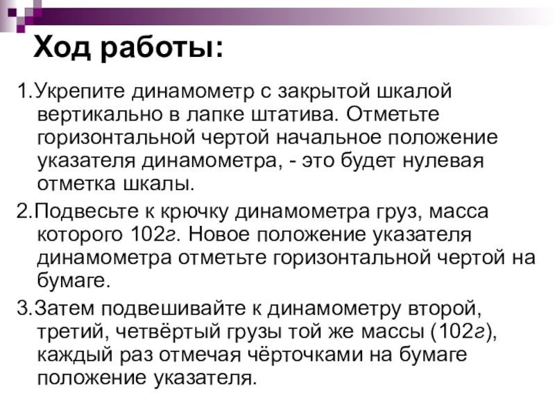 2.Подвесьте к крючку динамометра груз, масса которого 102г. Новое положение указателя динамометра отметьте горизонтальной чертой на бумаге.