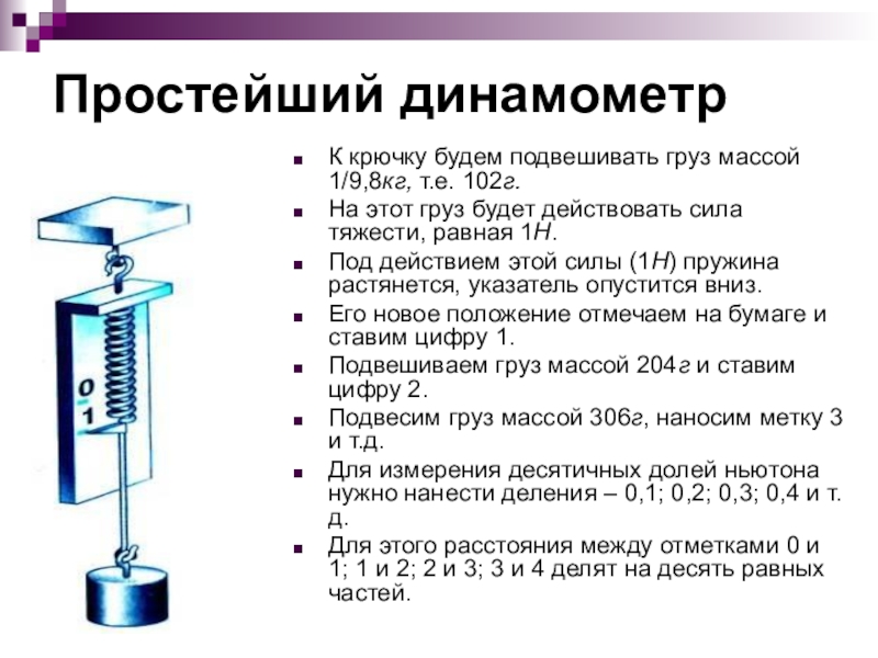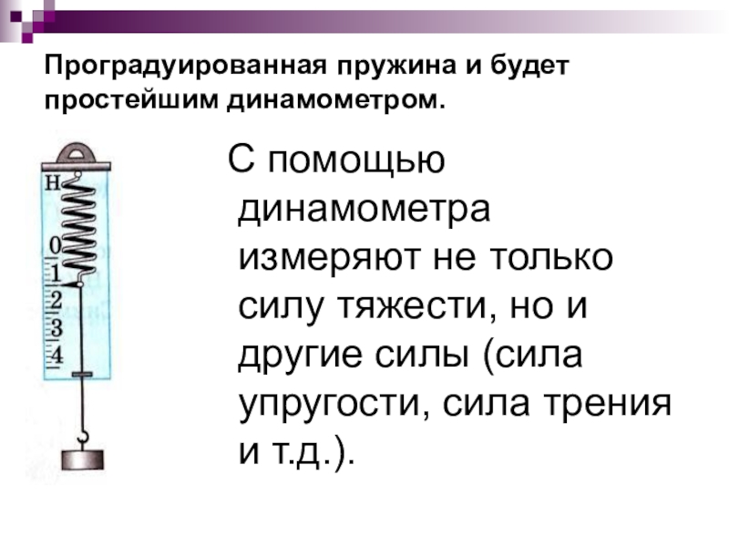 Слайд 7Проградуированная пружина и будет простейшим динамометром.