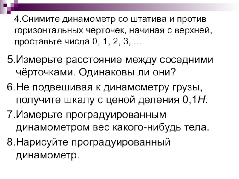 Слайд 184.Снимите динамометр со штатива и против горизонтальных чёрточек, начиная с верхней,