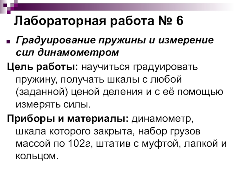 градуировать пружину, получать шкалы с любой (заданной) ценой деления и с её помощью измерять силы.