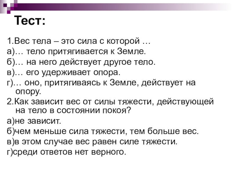 1.Вес тела – это сила с которой …
