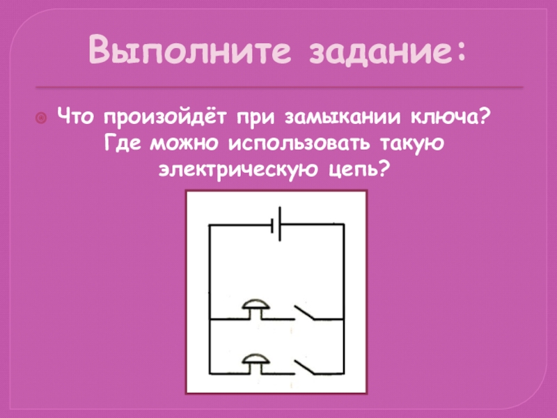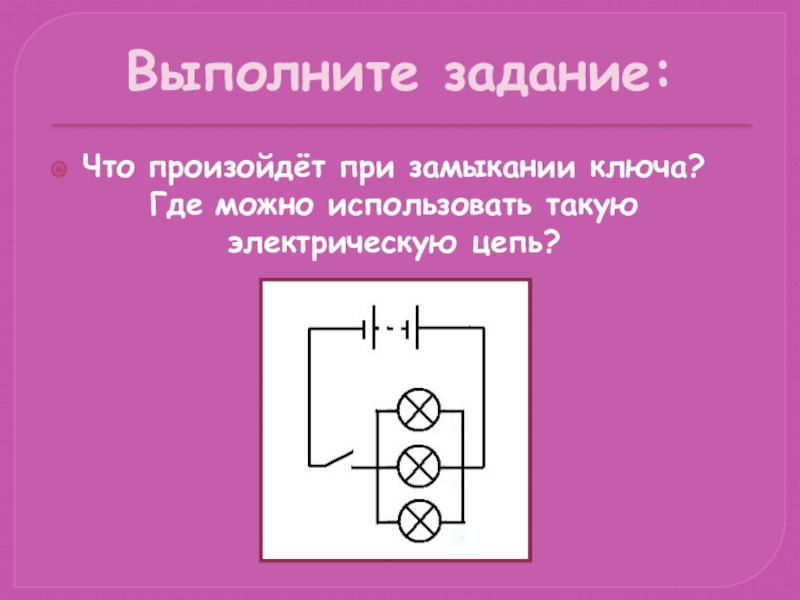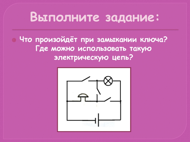 Выполните задание:Что произойдёт при замыкании ключа? Где можно использовать такую электрическую цепь?