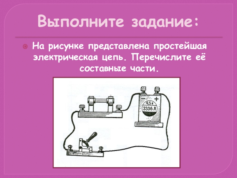 Выполните задание:На рисунке представлена простейшая электрическая цепь. Перечислите её составные части.