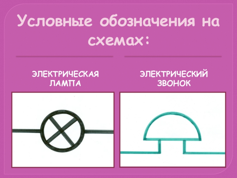 Условные обозначения на схемах:ЭЛЕКТРИЧЕСКАЯ ЛАМПАЭЛЕКТРИЧЕСКИЙ ЗВОНОК