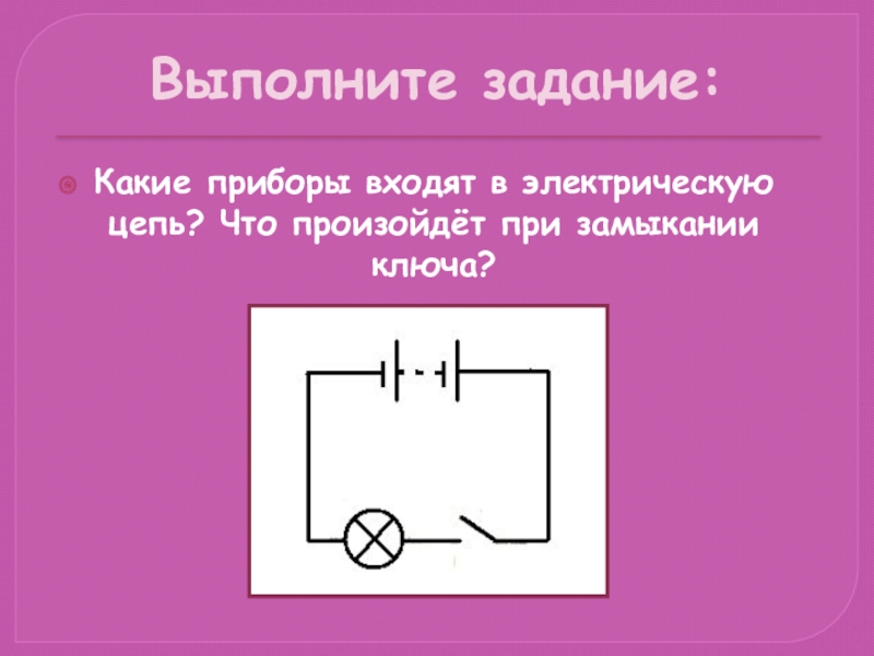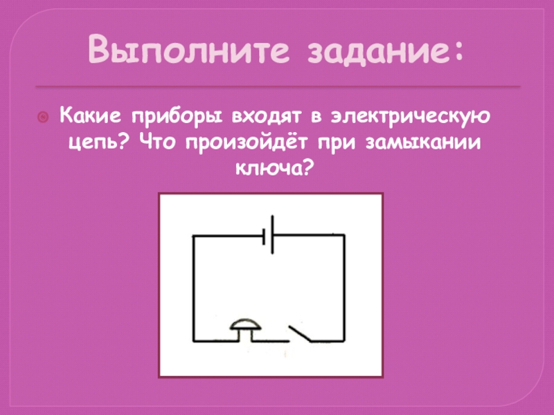 Выполните задание:Какие приборы входят в электрическую цепь? Что произойдёт при замыкании ключа?