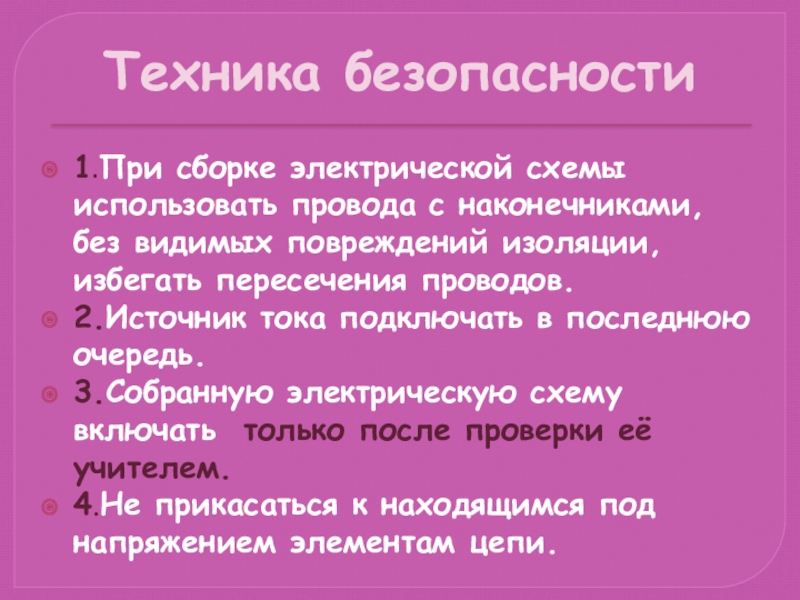 Техника безопасности1.При сборке электрической схемы использовать провода с наконечниками, без видимых повреждений изоляции, избегать пересечения проводов.2.Источник тока