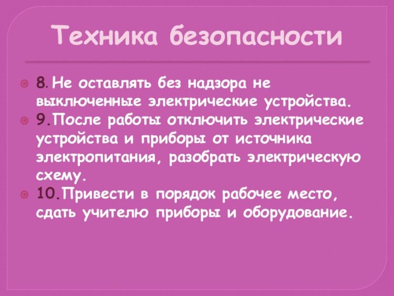 Техника безопасности8. Не оставлять без надзора не выключенные электрические устройства. 9.После работы отключить электрические устройства и приборы