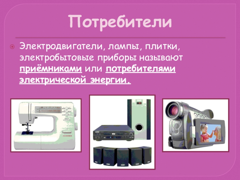 ПотребителиЭлектродвигатели, лампы, плитки, электробытовые приборы называют приёмниками или потребителями электрической энергии.