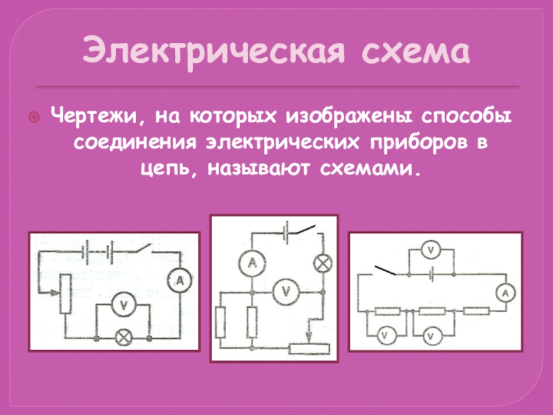 Электрическая схемаЧертежи, на которых изображены способы соединения электрических приборов в цепь, называют схемами.
