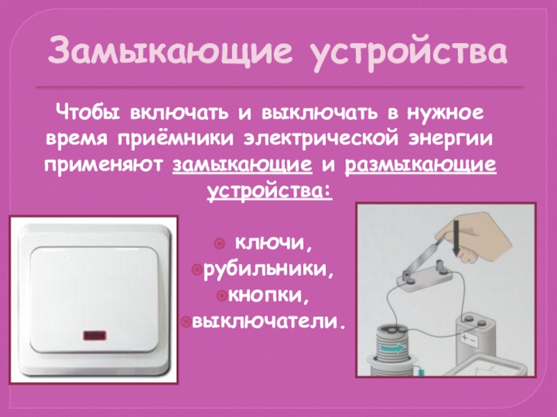 Замыкающие устройстваЧтобы включать и выключать в нужное время приёмники электрической энергии применяют замыкающие и размыкающие устройства: ключи,