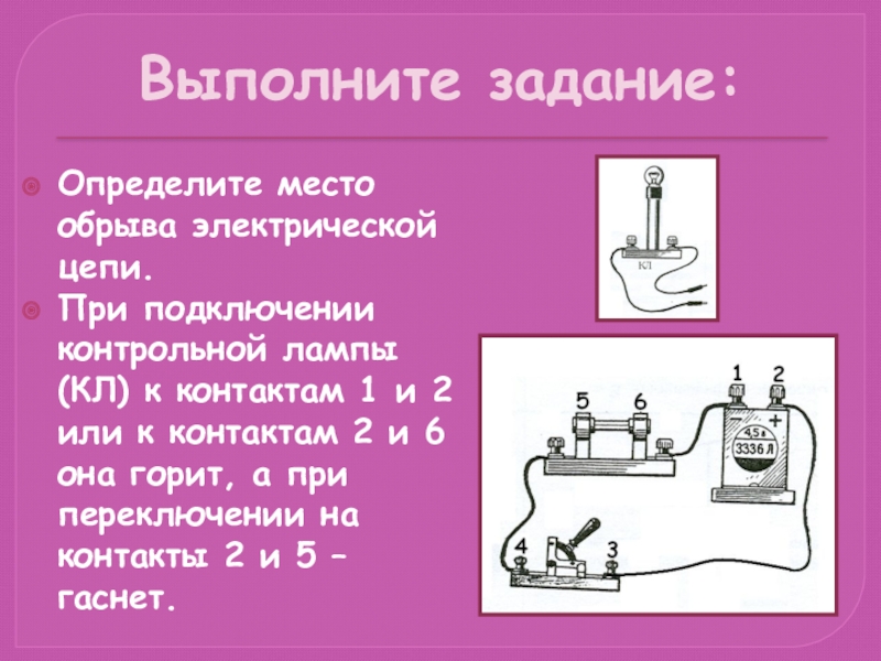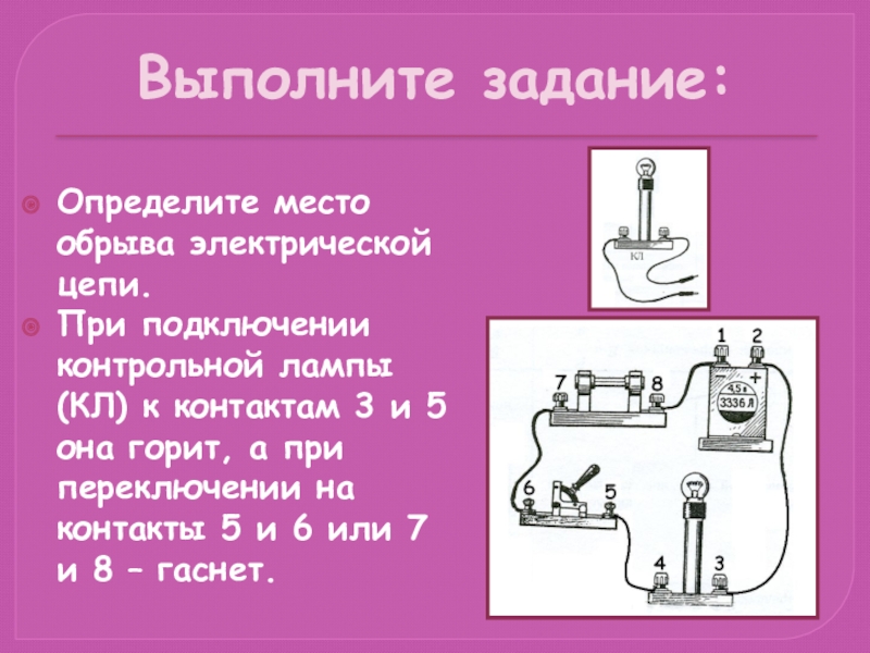 Выполните задание:Определите место обрыва электрической цепи.При подключении контрольной лампы (КЛ) к контактам 1 и 2 или к