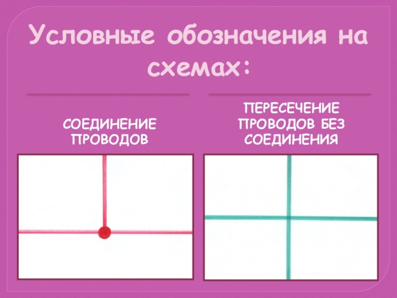 Условные обозначения на схемах:СОЕДИНЕНИЕ ПРОВОДОВПЕРЕСЕЧЕНИЕ ПРОВОДОВ БЕЗ СОЕДИНЕНИЯ