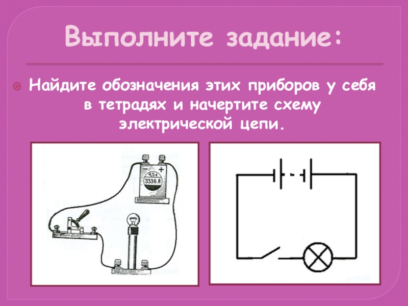 Выполните задание:Найдите обозначения этих приборов у себя в тетрадях и начертите схему электрической цепи.
