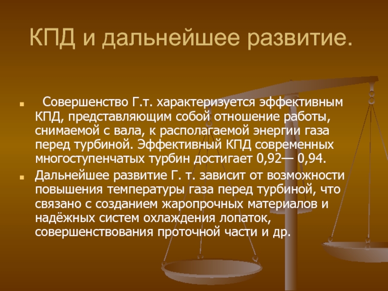 Дальнейшее развитие Г. т. зависит от возможности повышения температуры газа перед турбиной, что связано с созданием жаропрочных материалов и надёжных систем охлаждения лопаток, совершенствования проточной части и др.