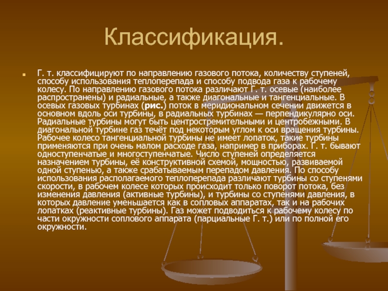 теплоперепада и способу подвода газа к рабочему колесу. По направлению газового потока различают Г. т. осевые (наиболее распространены) и радиальные, а также диагональные и тангенциальные. В осевых газовых турбинах (рис.) поток в меридиональном сечении движется в основном вдоль оси турбины, в радиальных турбинах — перпендикулярно оси. Радиальные турбины могут быть центростремительными и центробежными. В диагональной турбине газ течёт под некоторым углом к оси вращения турбины. Рабочее колесо тангенциальной турбины не имеет лопаток, такие турбины применяются при очень малом расходе газа, например в приборах. Г. т. бывают одноступенчатые и многоступенчатые. Число ступеней определяется назначением турбины, её конструктивной схемой, мощностью, развиваемой одной ступенью, а также срабатываемым перепадом давления. По способу использования располагаемого теплоперепада различают турбины со ступенями скорости, в рабочем колесе которых происходит только поворот потока, без изменения давления (активные турбины), и турбины со ступенями давления, в которых давление уменьшается как в сопловых аппаратах, так и на рабочих лопатках (реактивные турбины). Газ может подводиться к рабочему колесу по части окружности соплового аппарата (парциальные Г. т.) или по полной его окружности.
