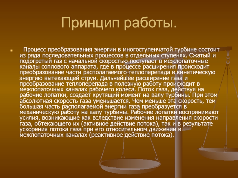 последовательных процессов в отдельных ступенях. Сжатый и подогретый газ с начальной скоростью поступает в межлопаточные каналы соплового аппарата, где в процессе расширения происходит преобразование части располагаемого теплоперепада в кинетическую энергию вытекающей струи. Дальнейшее расширение газа и преобразование теплоперепада в полезную работу происходит в межлопаточных каналах рабочего колеса. Поток газа, действуя на рабочие лопатки, создаёт крутящий момент на валу турбины. При этом абсолютная скорость газа уменьшается. Чем меньше эта скорость, тем большая часть располагаемой энергии газа преобразуется в механическую работу на валу турбины. Рабочие лопатки воспринимают усилия, возникающие как вследствие изменения направления скорости газа, обтекающего их (активное действие потока), так и в результате ускорения потока газа при его относительном движении в межлопаточных каналах (реактивное действие потока).
