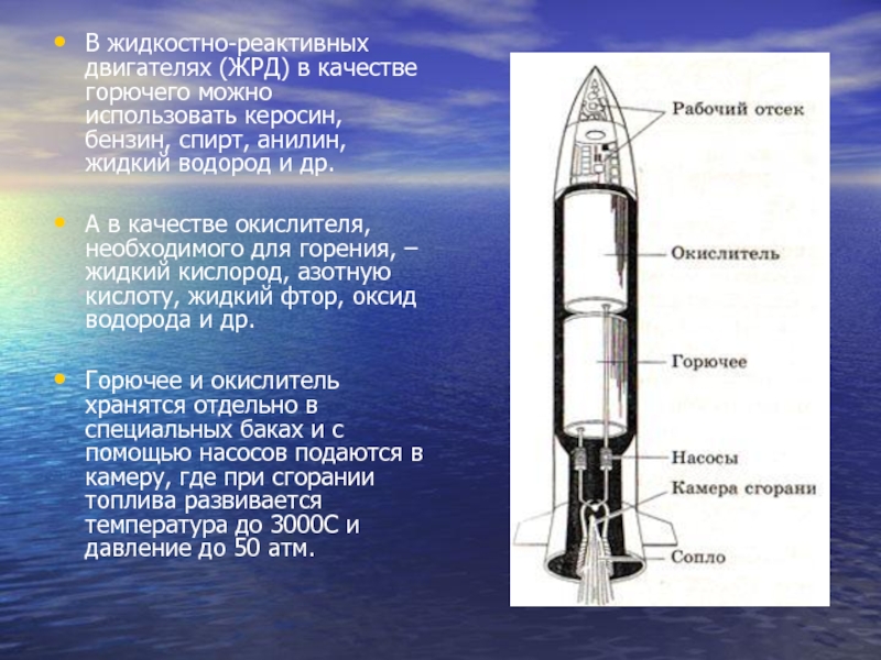 В жидкостно-реактивных двигателях (ЖРД) в качестве горючего можно использовать керосин, бензин,