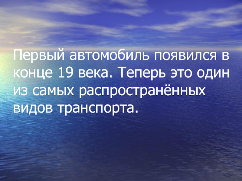Первый автомобиль появился в конце 19 века. Теперь это один из самых распространённых видов транспорта.