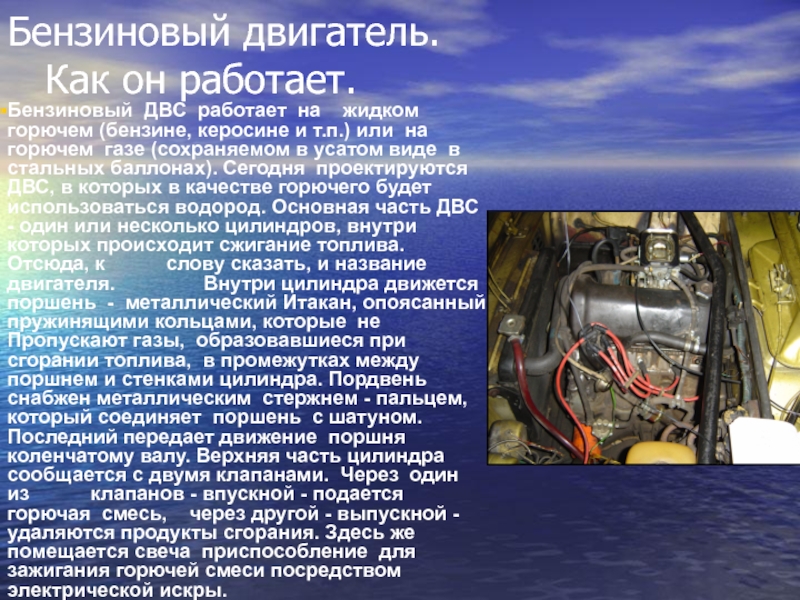 Бензиновый двигатель.    Как он работает.Бензиновый ДВС работает на  жидком  горючем (бензине, керосине