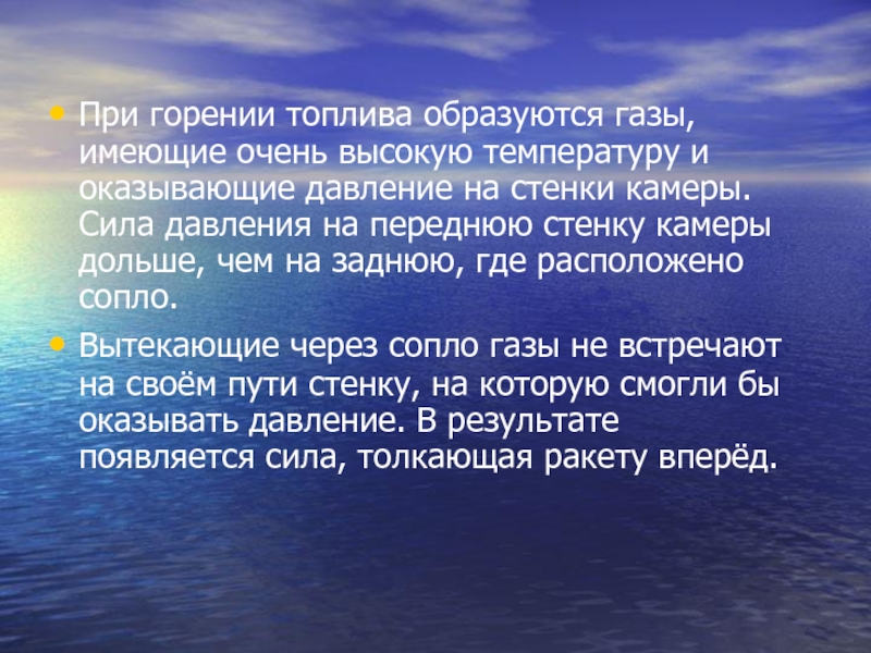 При горении топлива образуются газы, имеющие очень высокую температуру и оказывающие давление на стенки камеры. Сила давления