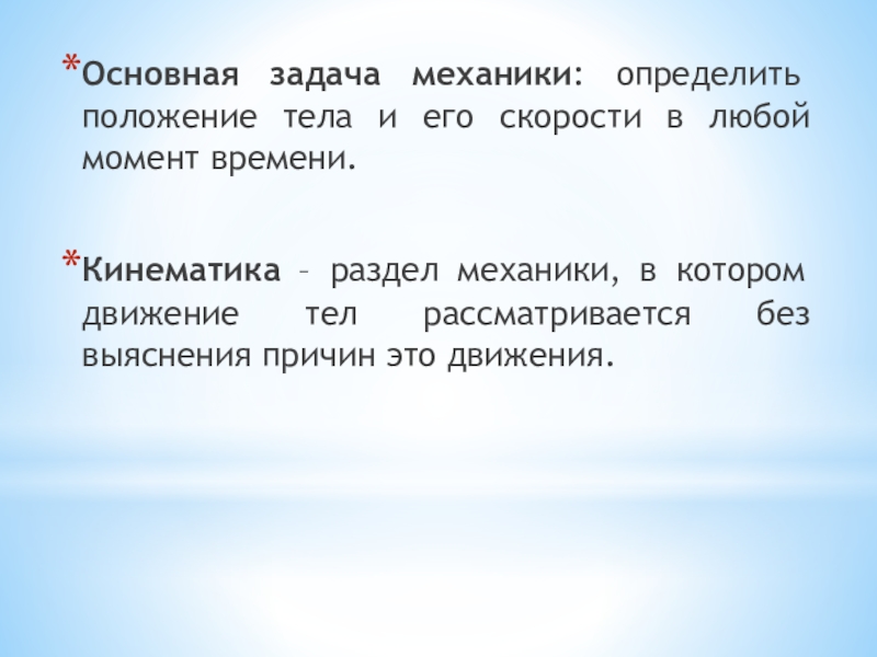 Основная задача механики: определить положение тела и его скорости в любой момент времени.Кинематика – раздел механики, в