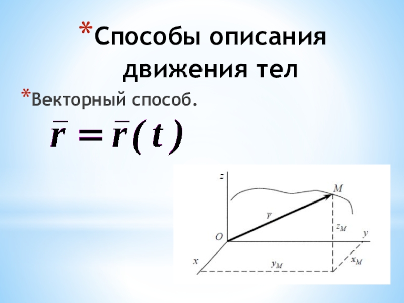 Способы описания движения телКоординатный способ.x = x (t)y = y (t)z = z(t)