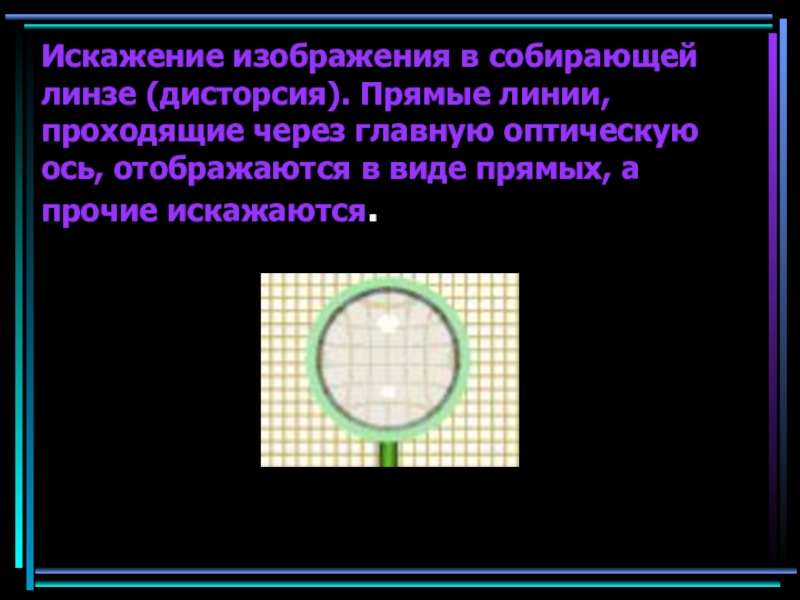 Слайд 20Искажение изображения в собирающей линзе (дисторсия). Прямые линии, проходящие через главную