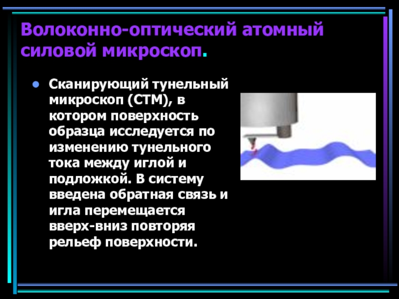 Волоконно-оптический атомный силовой микроскоп.Сканирующий тунельный микроскоп (СТМ), в котором поверхность образца исследуется по изменению тунельного тока между иглой и подложкой. В систему введена обратная связь и игла перемещается вверх-вниз повторяя рельеф поверхности.