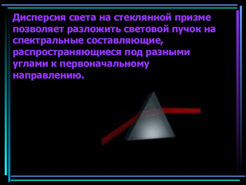 Слайд 13Дисперсия света на стеклянной призме позволяет разложить световой пучок на спектральные