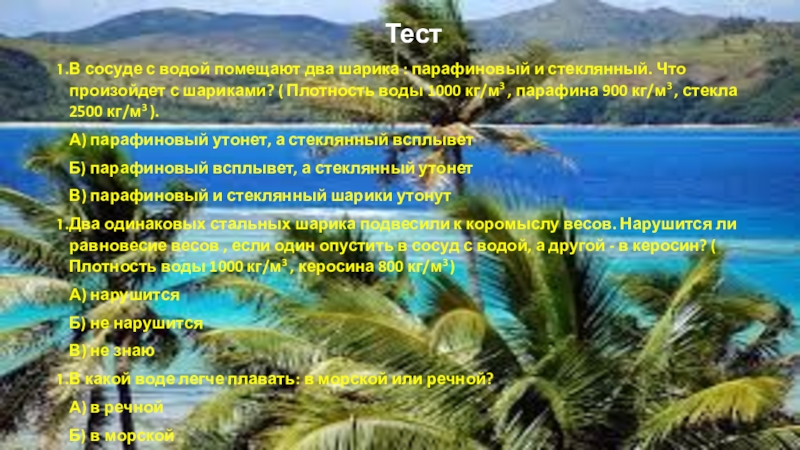 1.Тело плавает, будучи полностью погруженным в жидкость, если плотность тела равна плотности жидкости