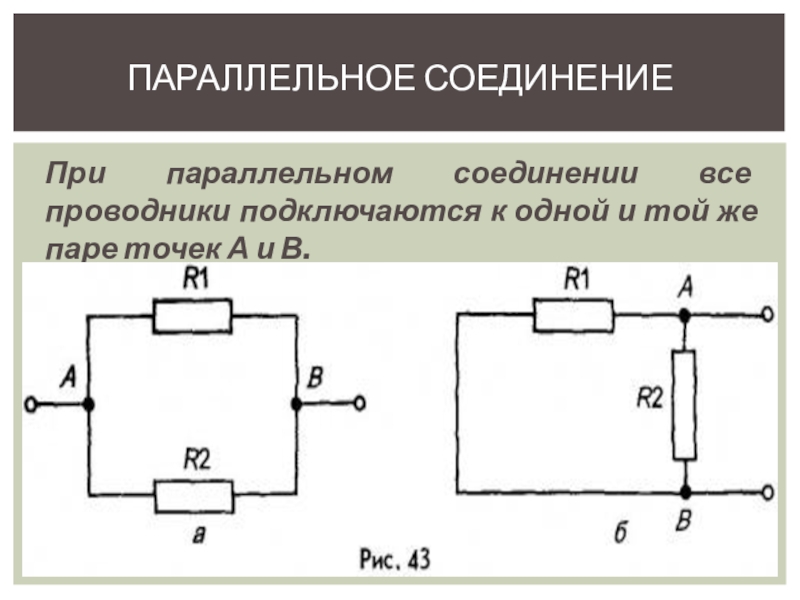 При параллельном соединении все проводники подключаются к одной и той же паре точек А и В.Параллельное соединение
