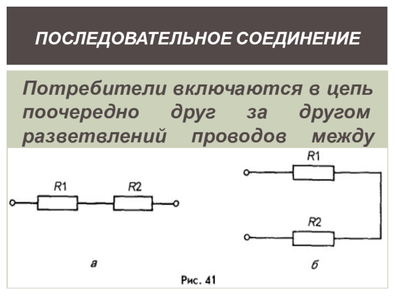 Потребители включаются в цепь поочередно друг за другом разветвлений проводов между ними.Последовательное соединение